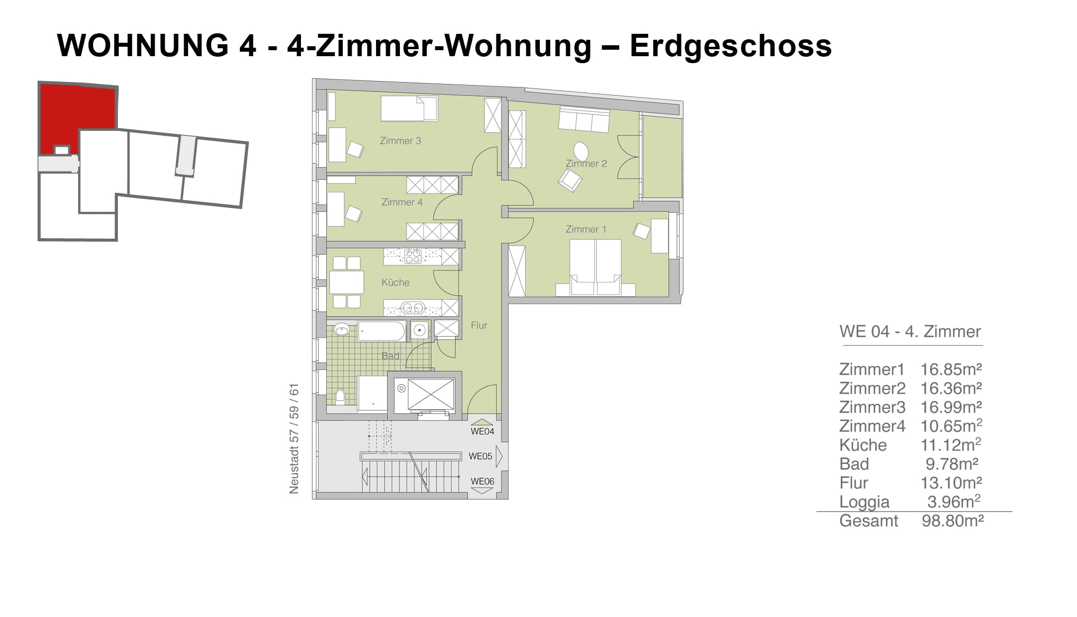 Es wurden drei 2-Zimmer- Wohnungen, zwei 2,5-Zimmer- Wohnungen, sieben 3- Zimmer-Wohnungen und eine 4-Zimmer Wohnung errichtet. Jede Wohnung verfügt über eine Terrasse, einen Balkon oder eine Loggia, welche sich zur Gartenseite orientieren. Die lichten Raumhöhen in den Wohnungen betragen ca. 2,75 m.